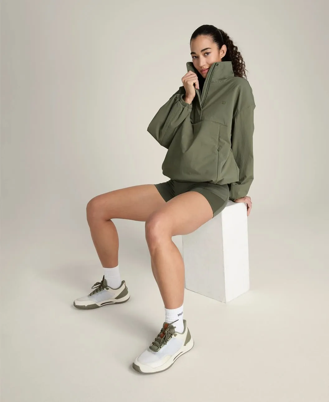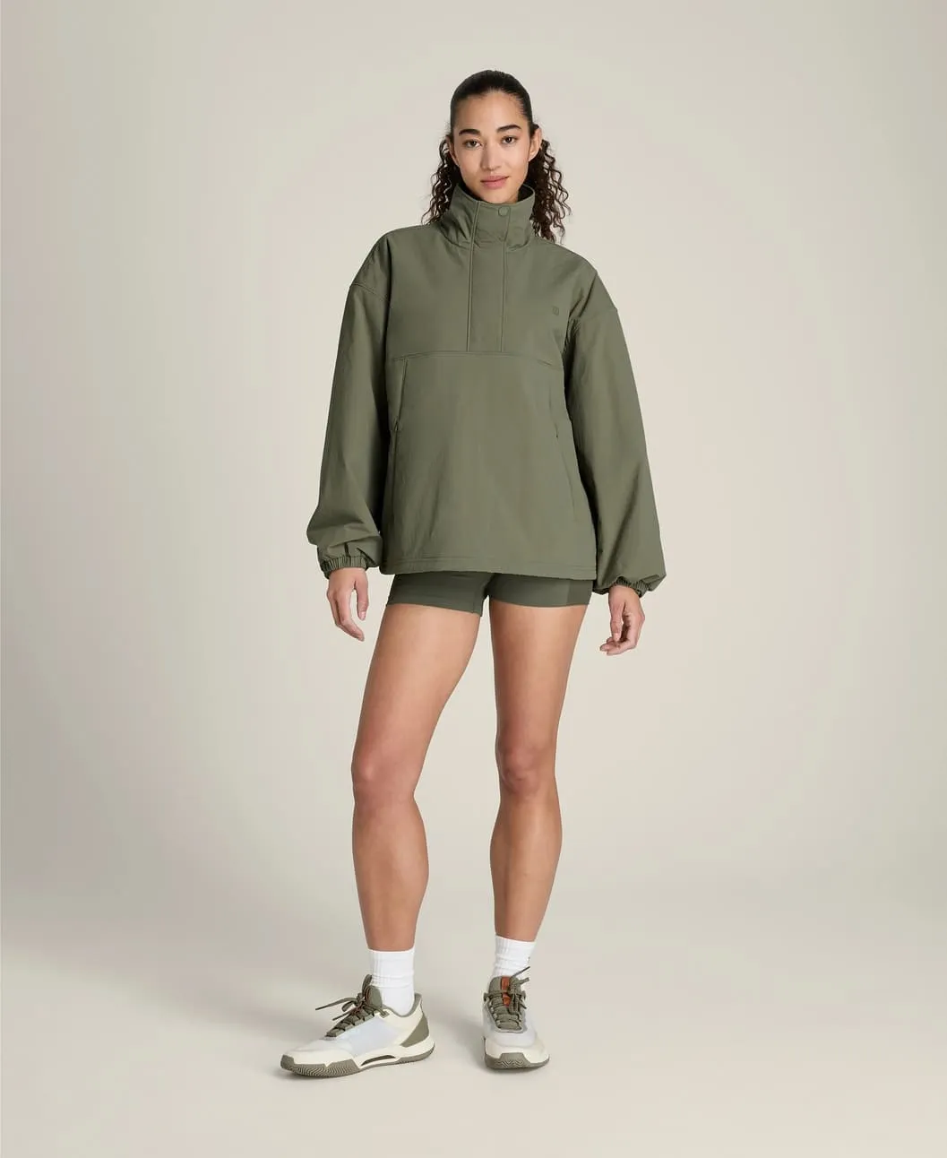 Куртка выполнена в свободном oversize-крое, благодаря чему её легко надевать поверх спортивной одежды. Полу-кнопочная застёжка облегчает надевание и снятие, а также позволяет регулировать вентиляцию.