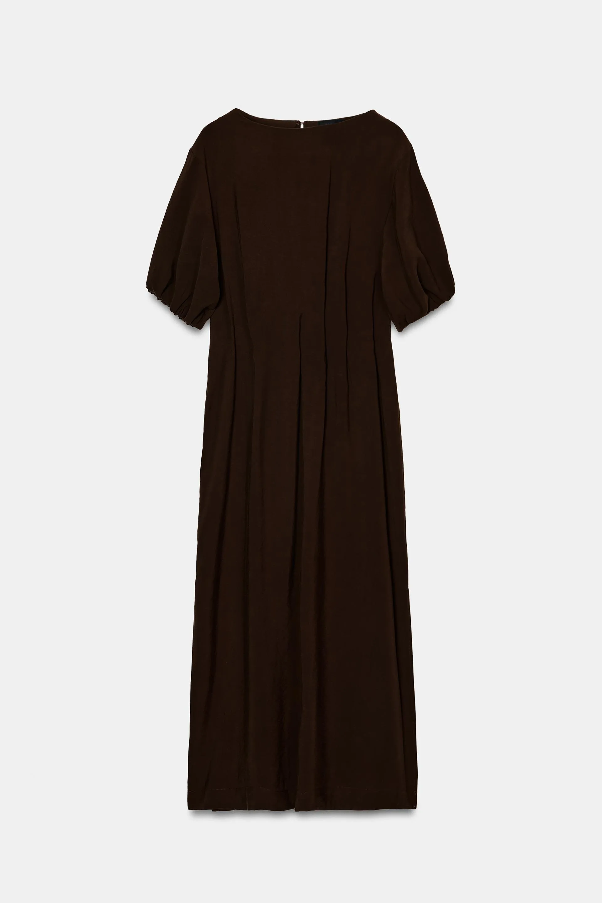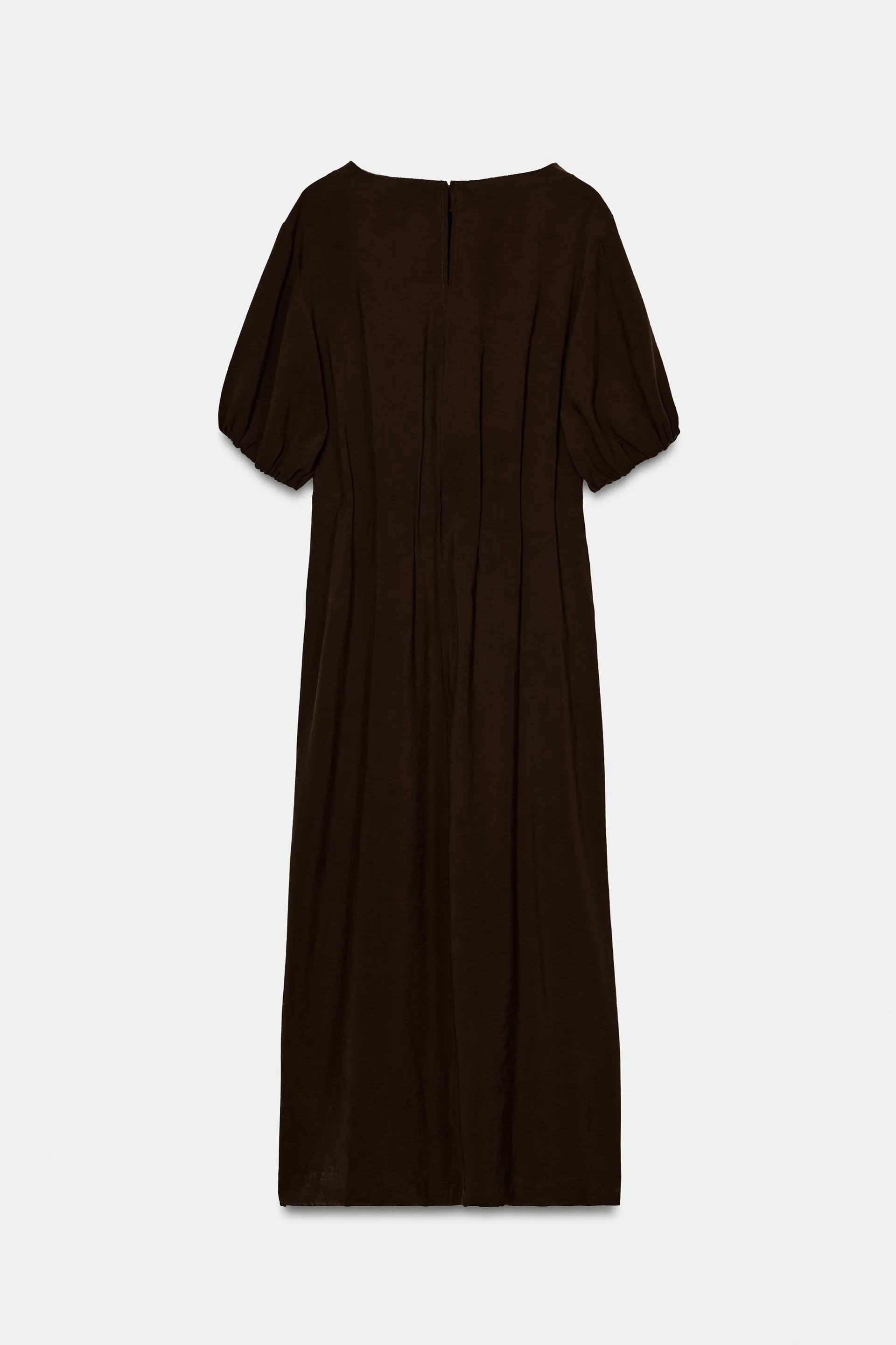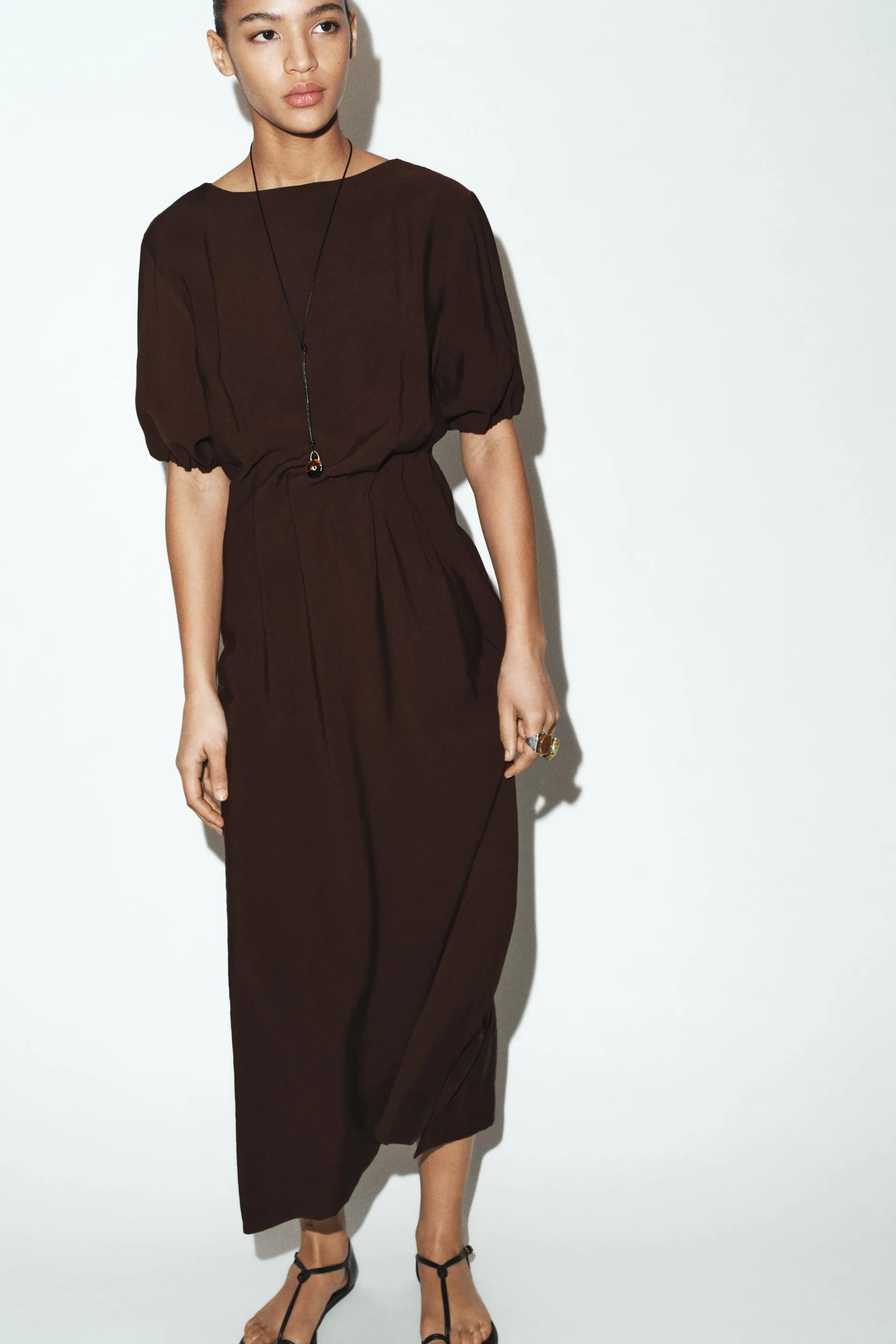 Flowy Pleated Midi Dress — лёгкое струящееся платье с плиссировкой, созданное для движения и женственности без усилий. Мягкий силуэт, воздушные рукава и акцент на талии делают образ одновременно романтичным и современным.