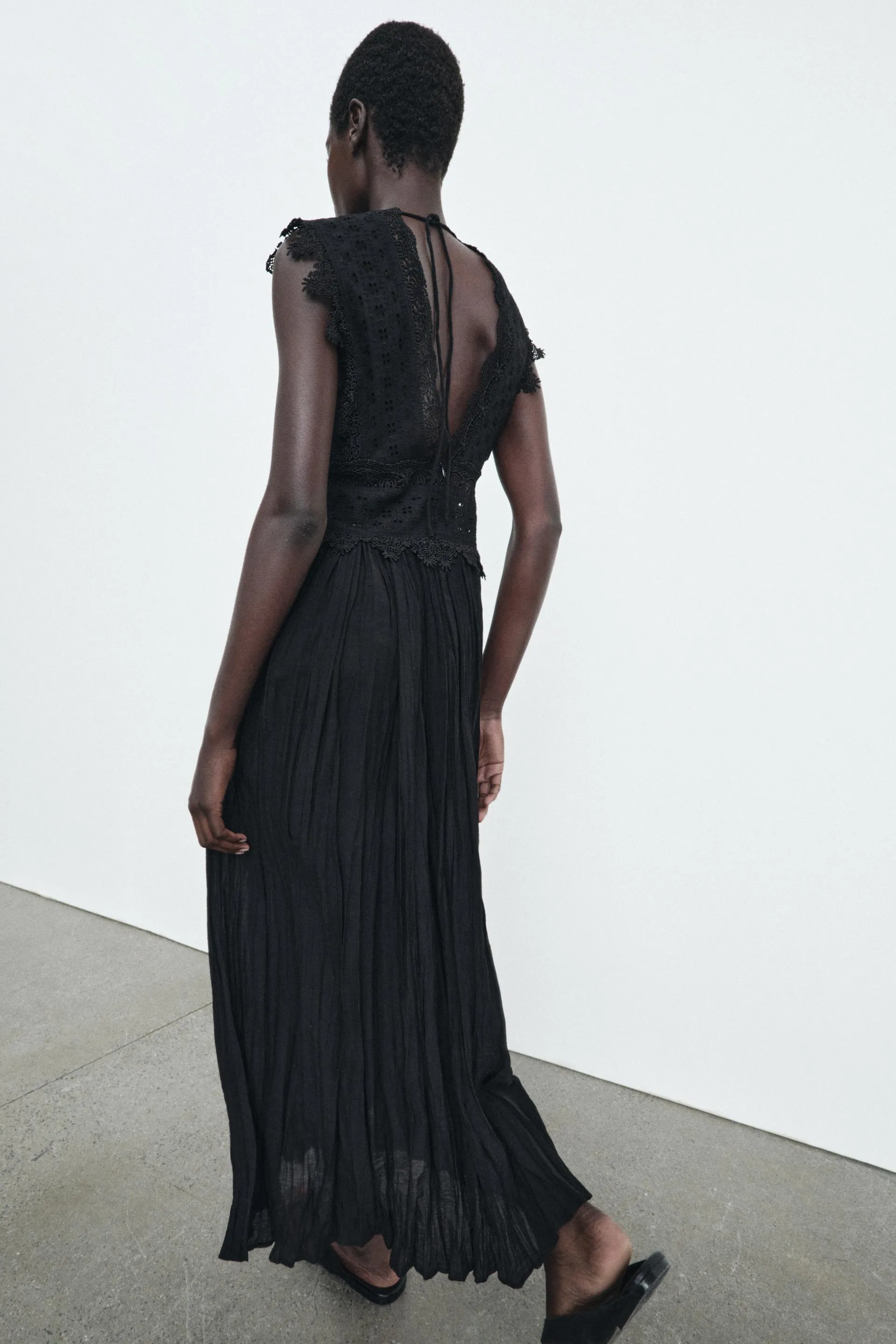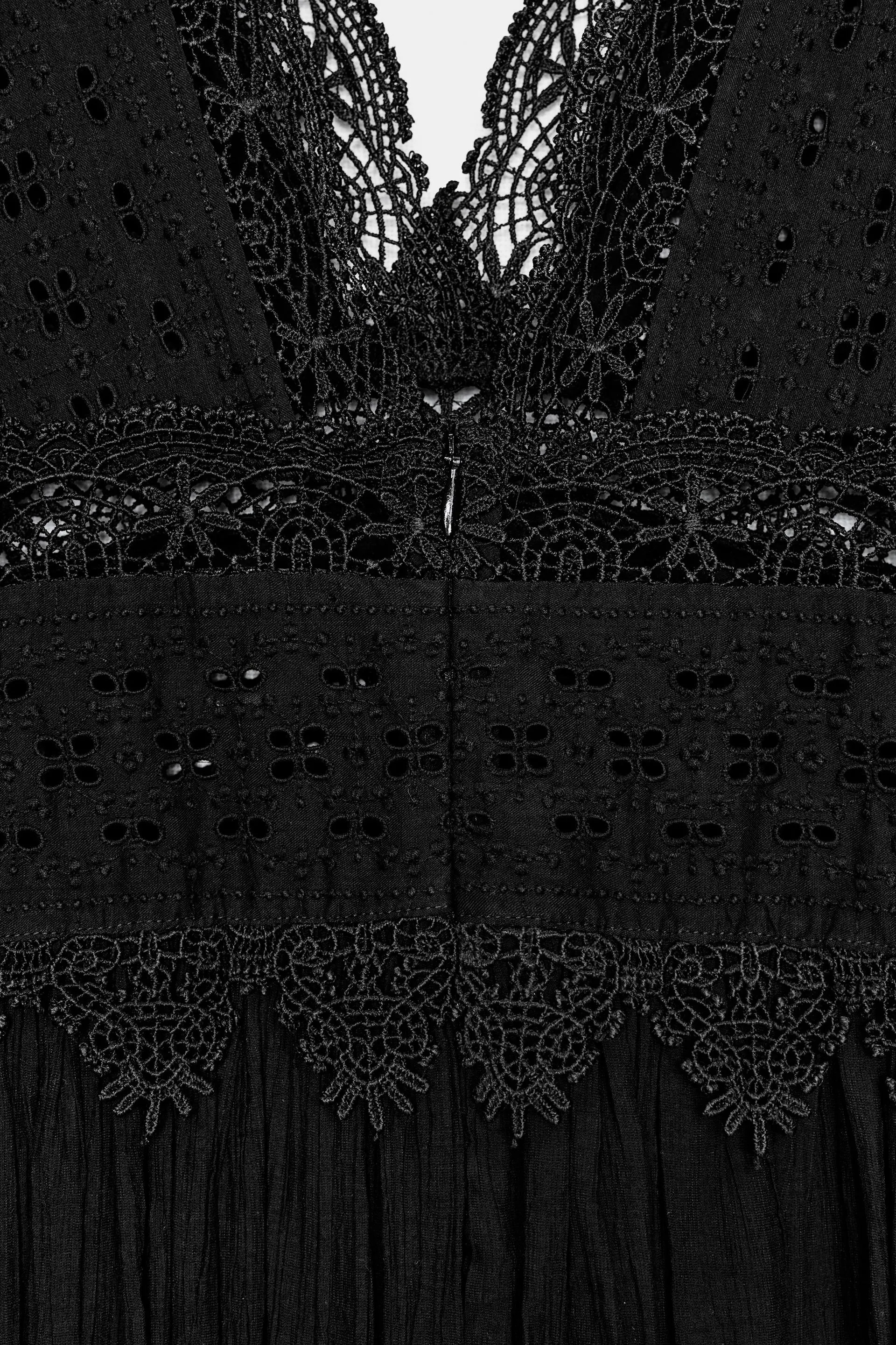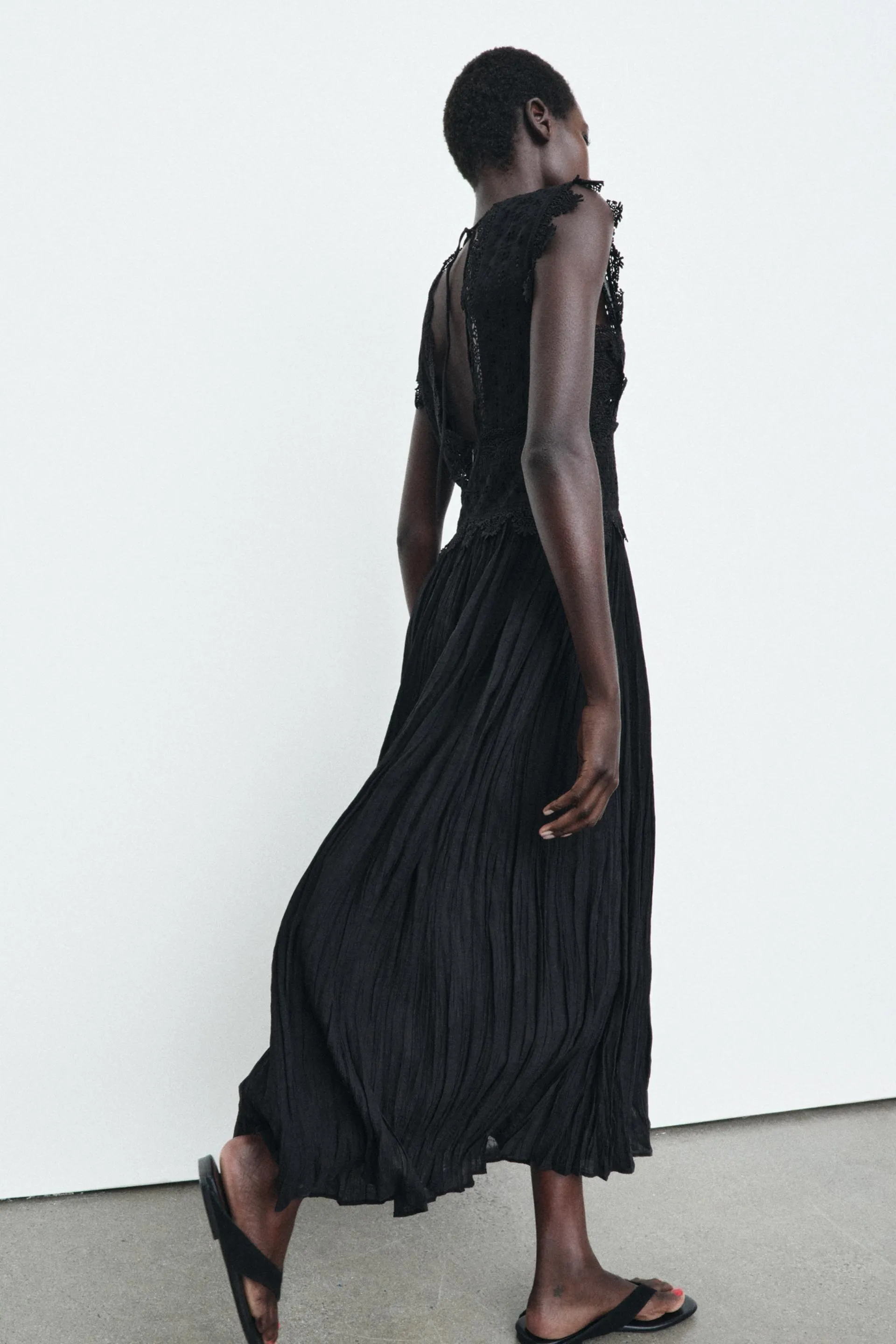 Lace Dress ZW Collection — изысканное миди-платье из линии Zara Woman, созданное для элегантных выходов и особых моментов. Лёгкая фактурная ткань, тонкая вышивка и деликатное кружево создают тот самый премиальный и утончённый образ.