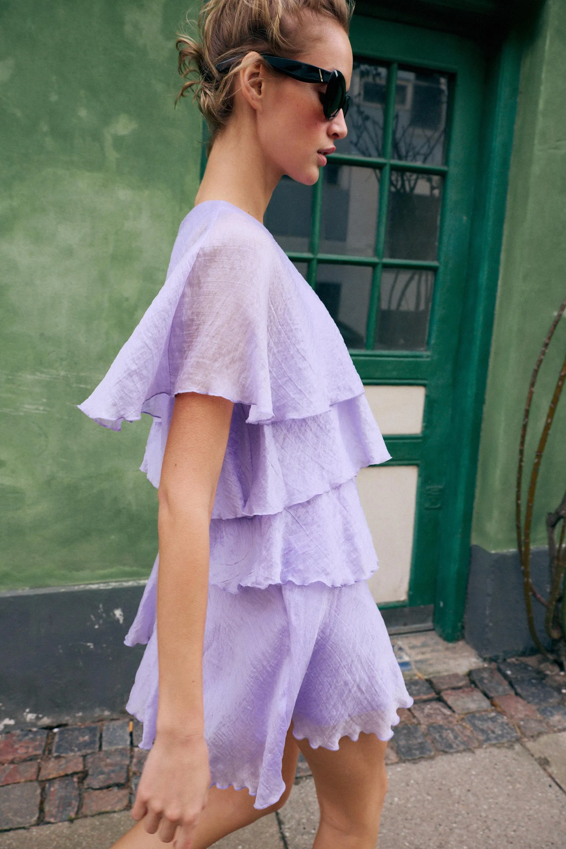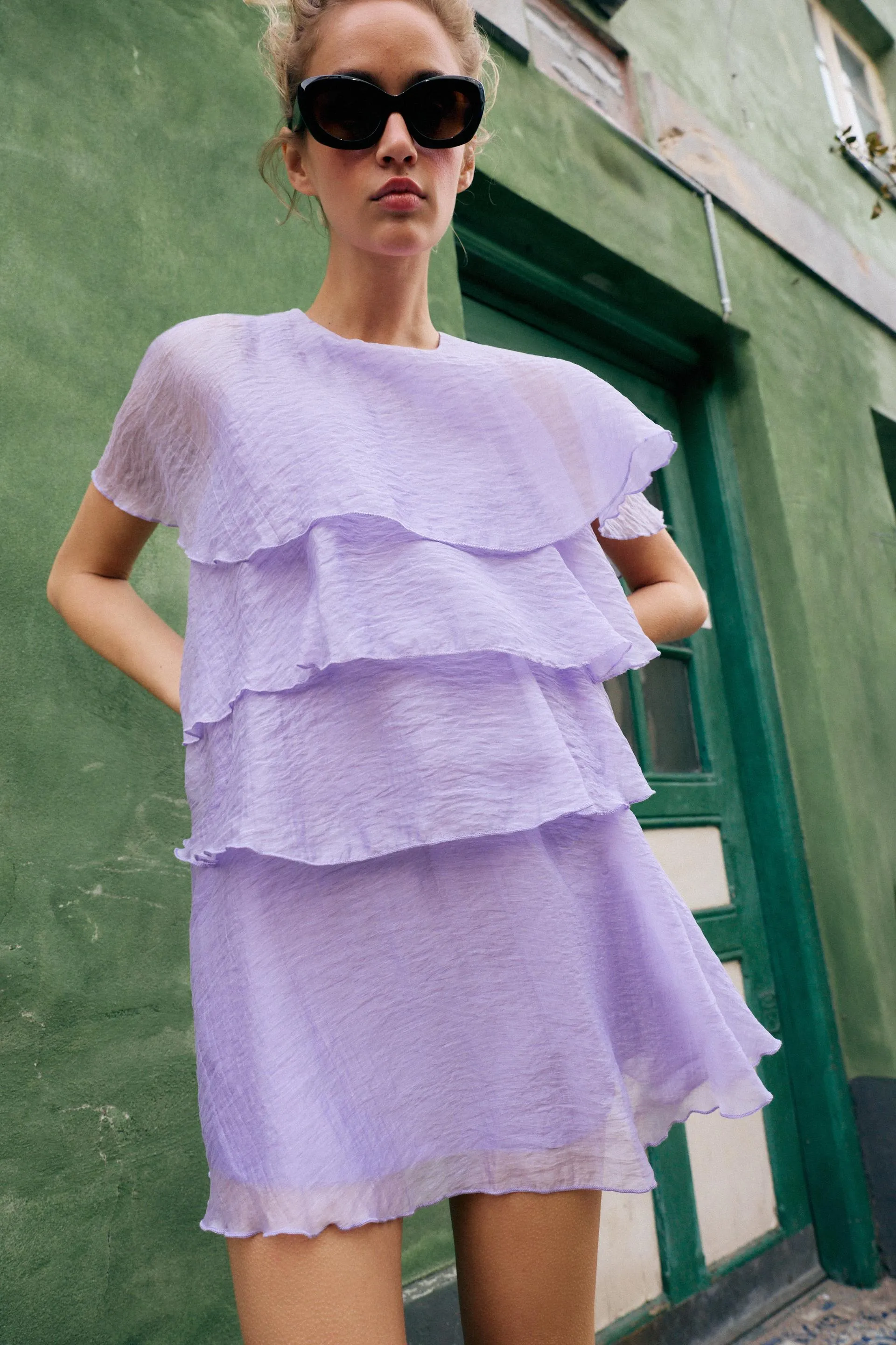 Ruffled Mini Dress — лаконичное мини-платье с романтичным настроением и деликатными рюшами. Лёгкая ткань красиво струится и создаёт аккуратный силуэт, который выглядит одновременно свежо, женственно и очень современно.