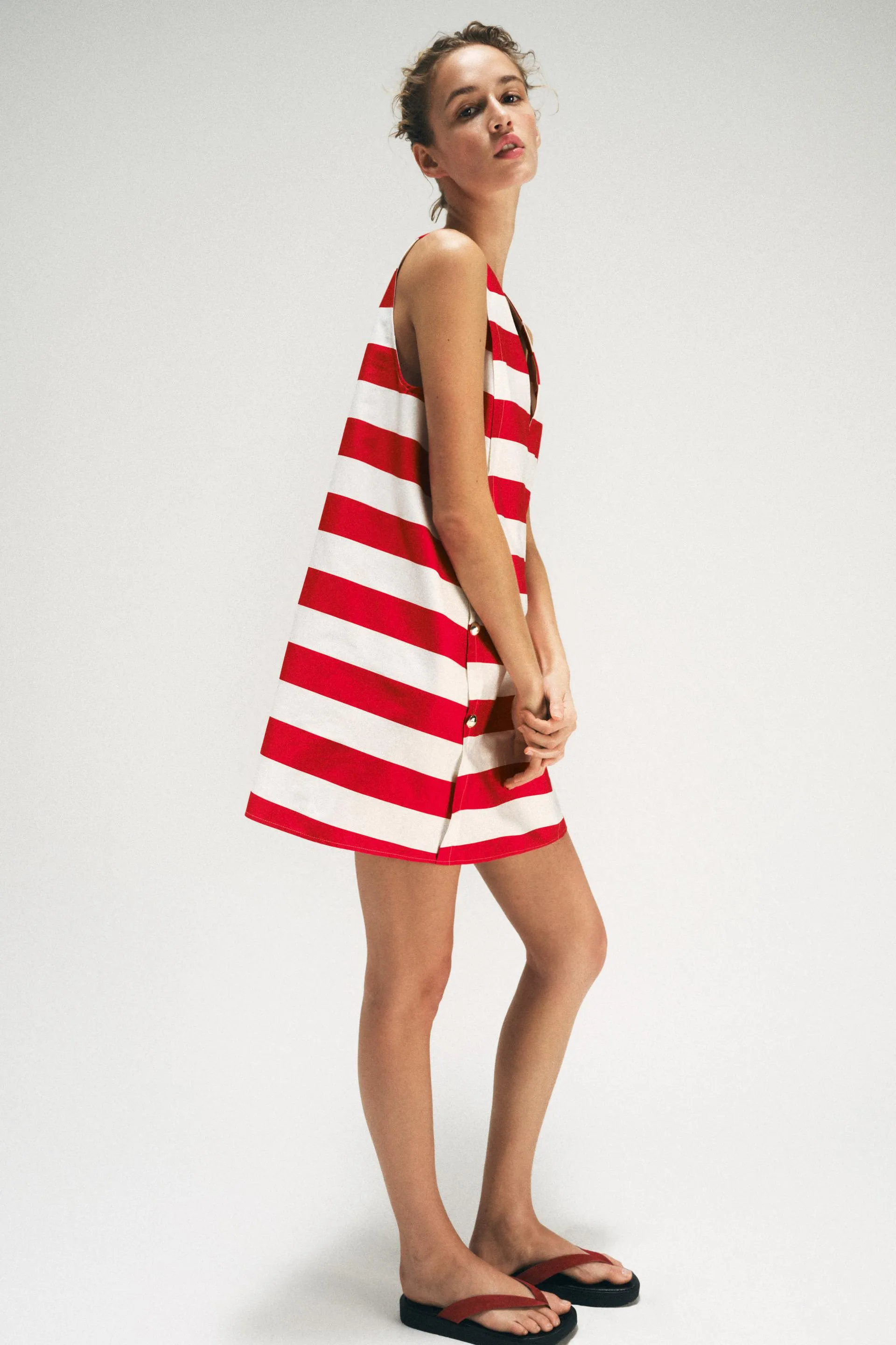 Striped Mini Dress — лёгкое мини-платье в полоску с V-образным вырезом и чистым, лаконичным силуэтом. Минимализм с характером, который легко превращается в идеальный летний образ.