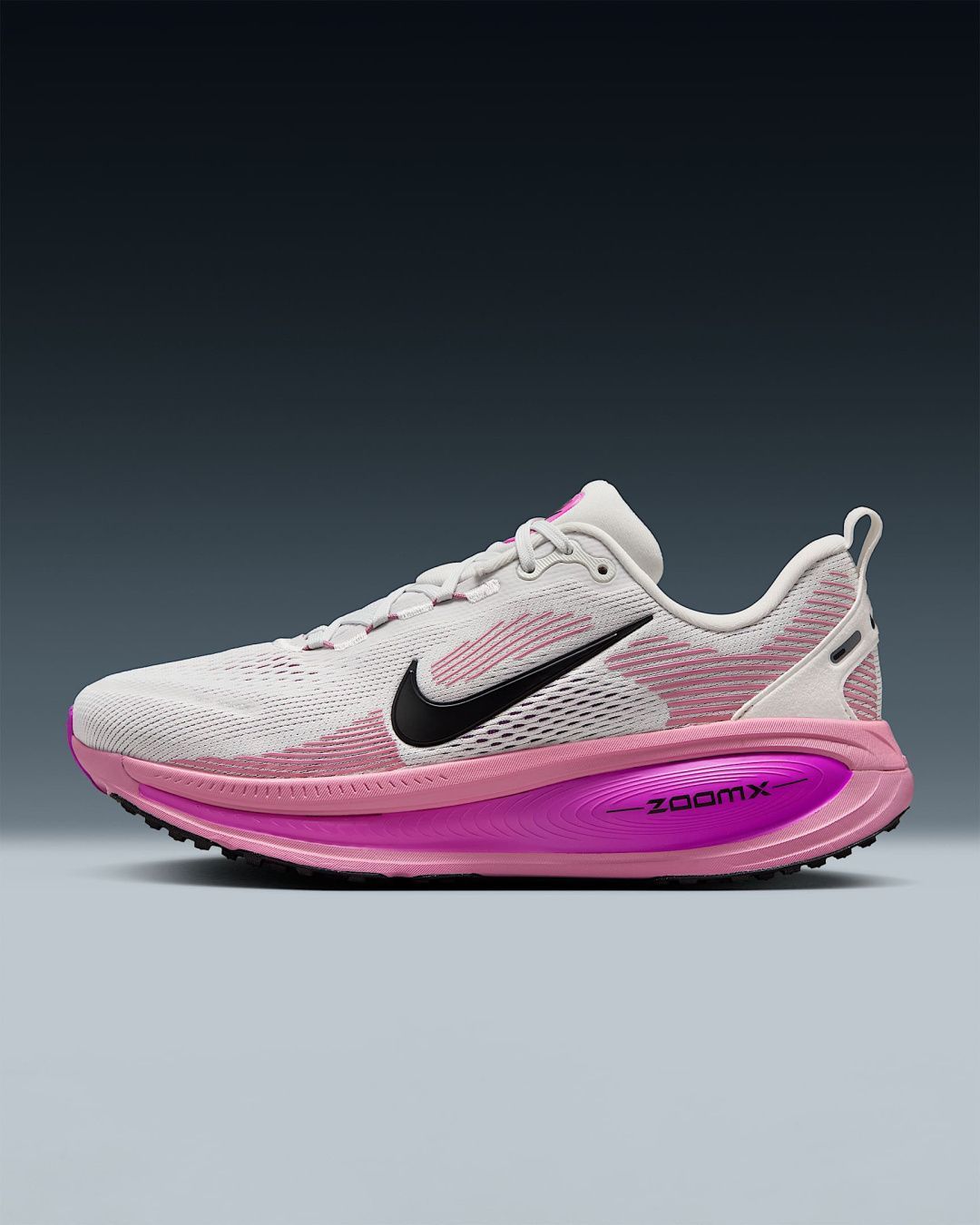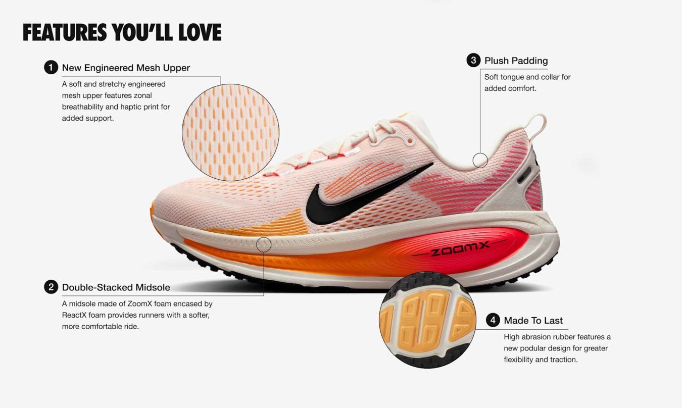 Nike Vomero — это кроссовки с максимальной амортизацией, обеспечивающие комфорт на каждый день. В их подошве использована легкая пена ZoomX, расположенная поверх упругой ReactX, что делает ходьбу и бег еще мягче. Обновленный рисунок протектора помогает плавно перекатываться с пятки на носок.Основные особенности: