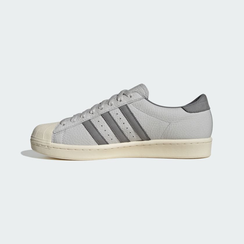 В этой модели все построено на оттенках серого — разные тона нейтрального цвета придают классическому дизайну сдержанный вид. Завершает образ золотой логотип adidas Superstar, который выделяется на боковой стороне.