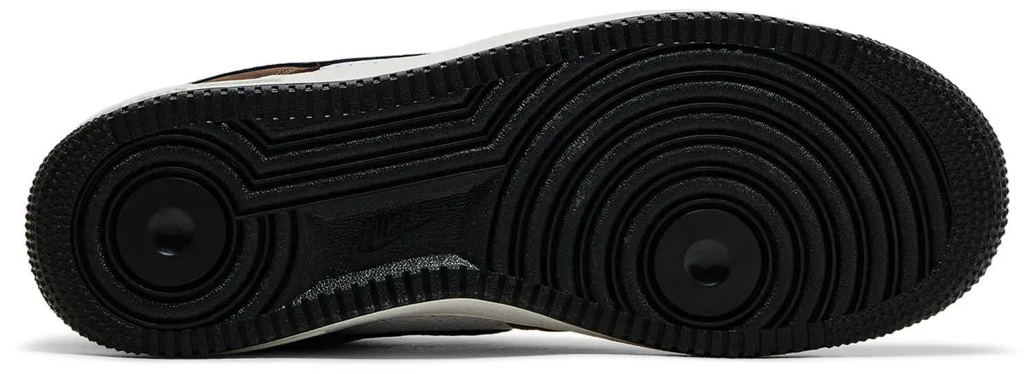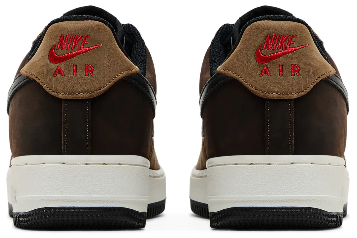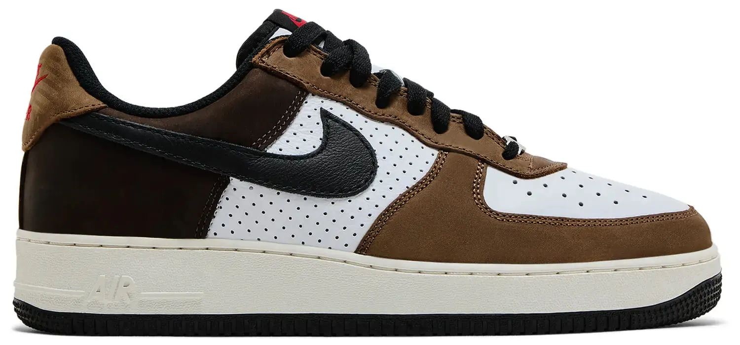 Модель выполнена из высококачественной белой кожи с перфорацией по бокам для лучшей вентиляции. Акценты из замши тёплых оттенков добавляют глубины образу: светло-коричневая зона носка сочетается с насыщенно-бордовой вставкой на пятке (Medium Brown и Baroque Brown). Чёрный кожаный Swoosh добавляет контраста, а фирменные логотипы Nike Air на язычке и пятке оформлены в насыщенном красном цвете.