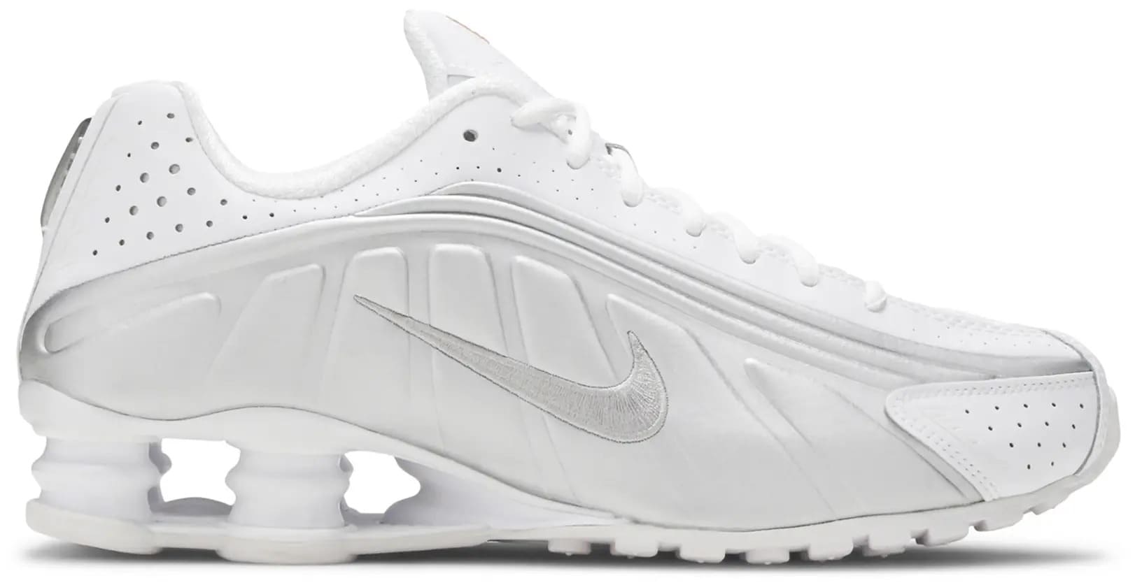 Модель Nike Shox R4 ‘White Metallic’ образца 2019 года — это современная интерпретация оригинальной пары, впервые представленной в 2000-м. Силуэт сохраняет характерные черты, ставшие знаковыми для всей линейки, и при этом получает свежий, минималистичный облик.