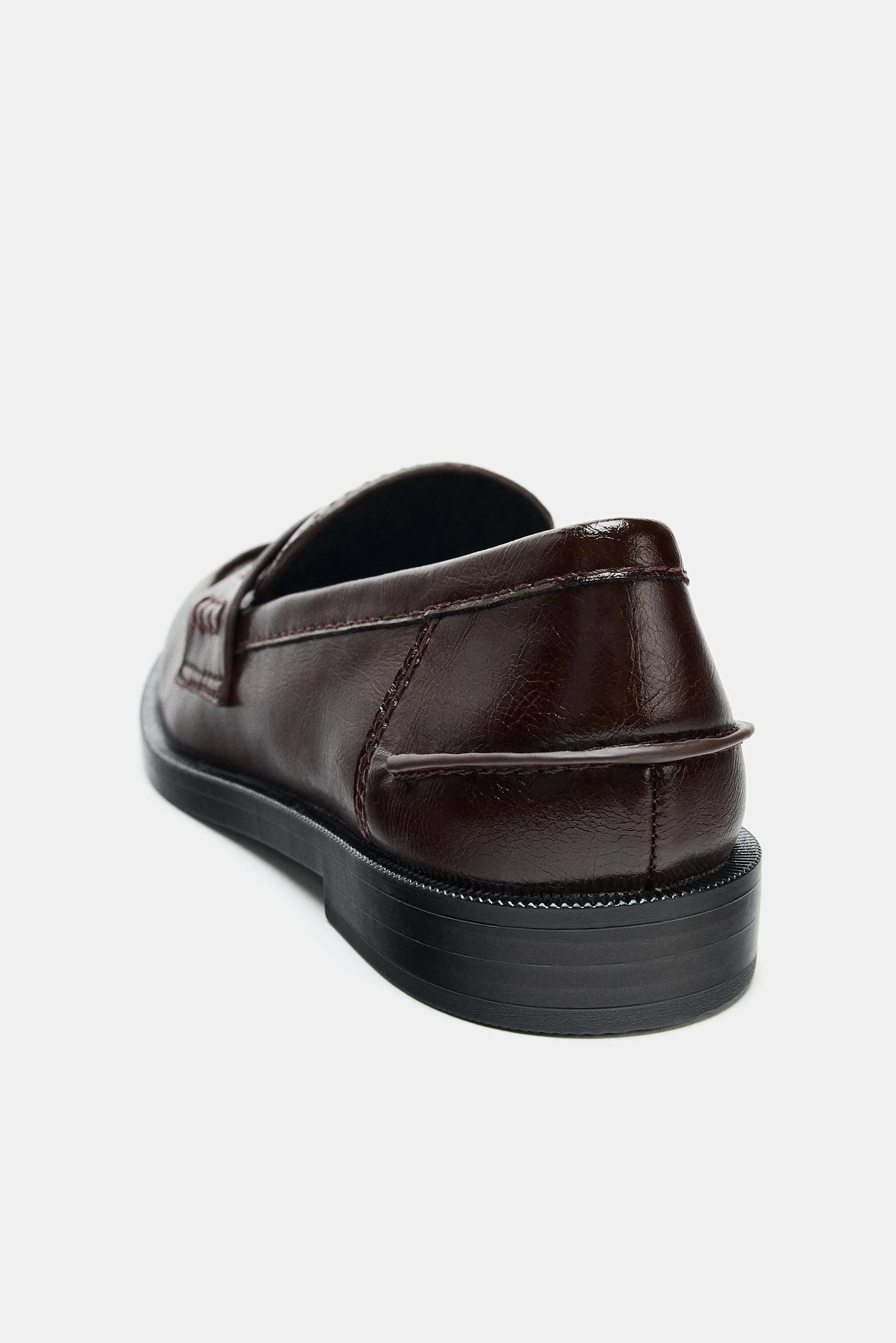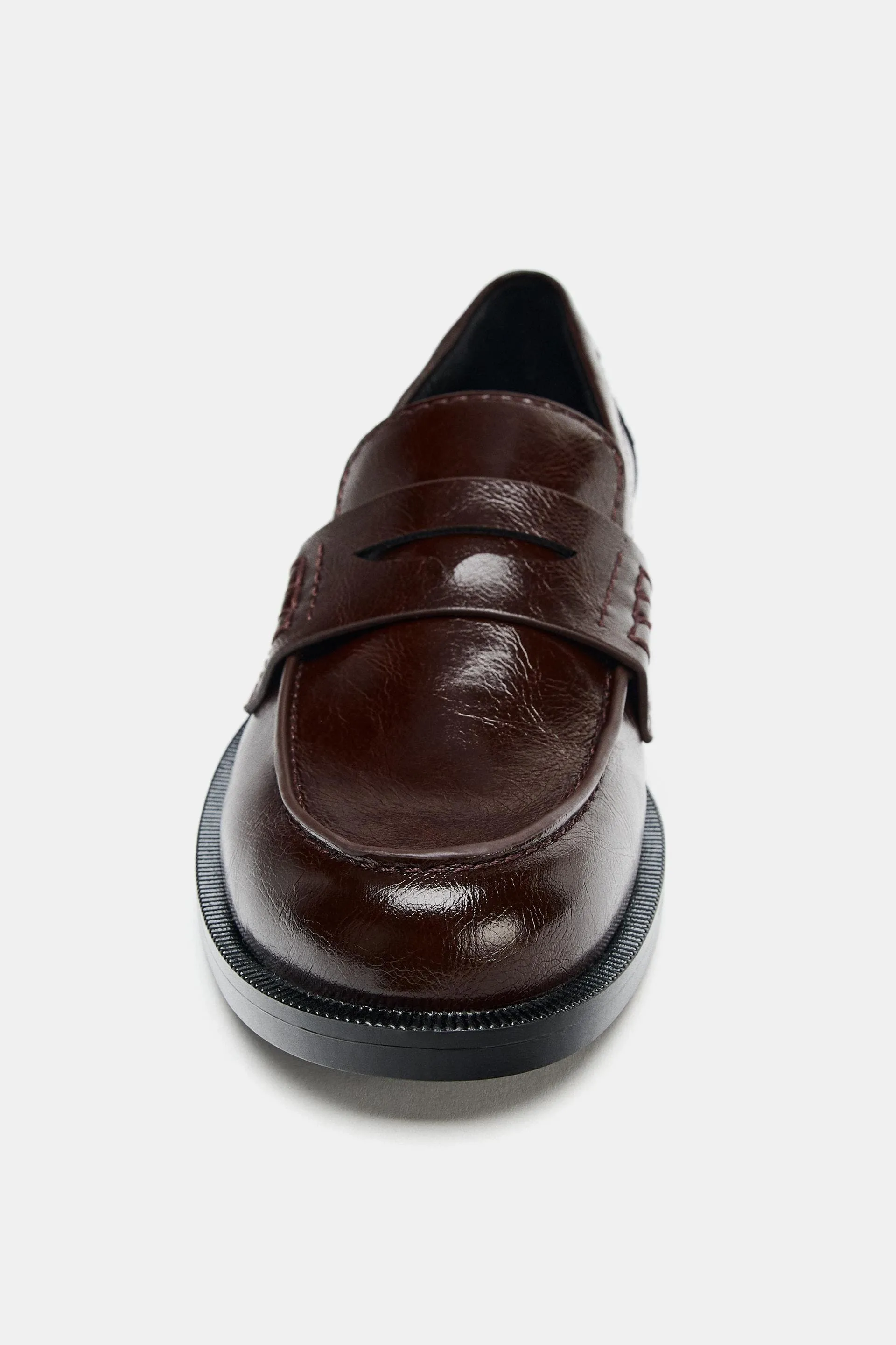 Patent Effect Penny Loafers — культовая классика в глянцевом исполнении. Лаковый финиш, высокая союзка и фирменная перемычка создают эффект «дорогого минимализма», который легко вписывается и в деловые, и в повседневные образы.