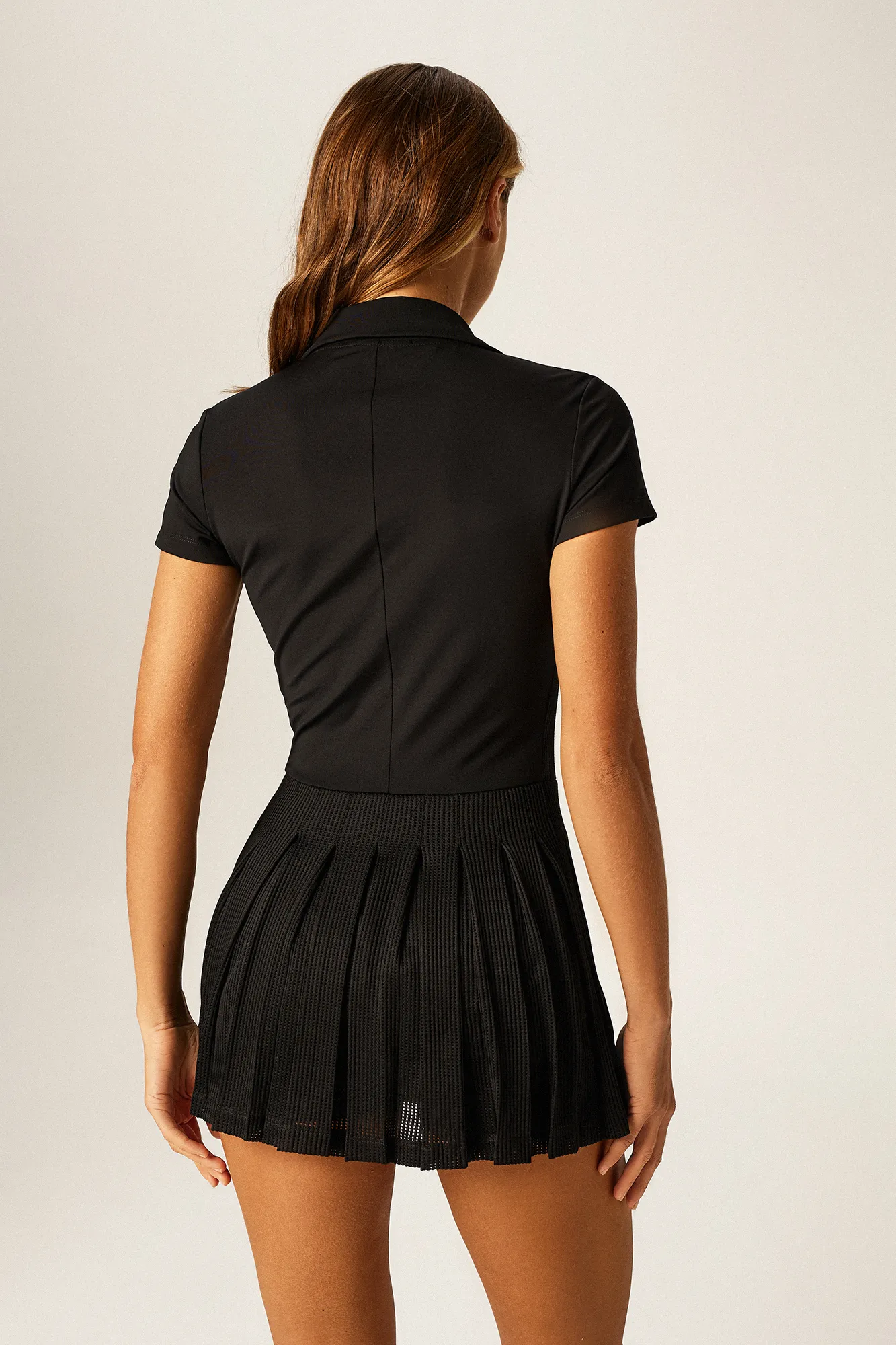 Комбинезон прекрасно сидит по фигуре и обеспечивает необходимую вентиляцию благодаря перфорированным вставкам. Под юбкой мы вшили легкие шорты для дополнительного комфорта и свободы движений. Это позволяет чувствовать себя уверенно в любой ситуации.