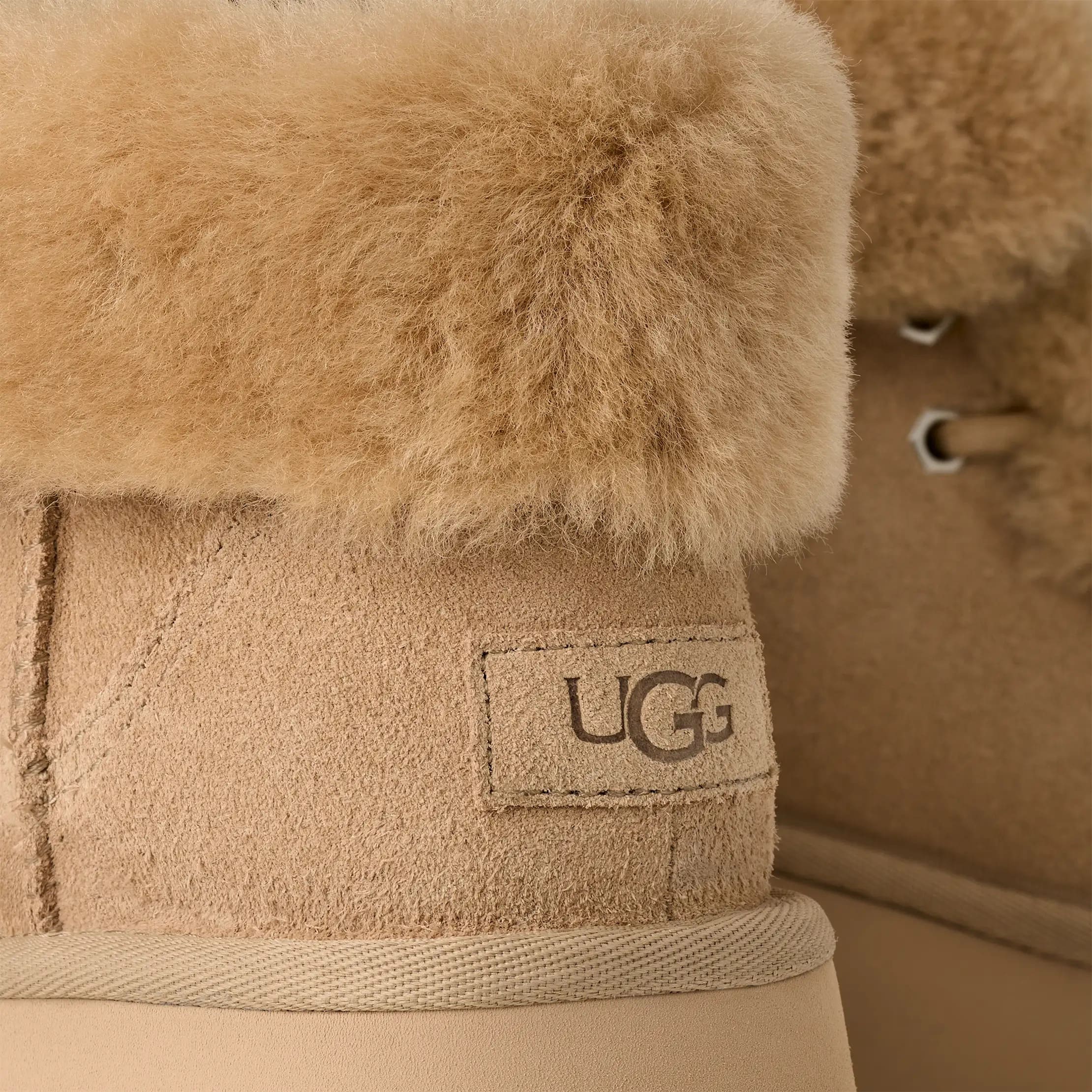 UGG Esmee Lace Up — эволюция классических UGG® с модным акцентом. Верх из замши украшен пушистой овчиной по шву, а голенище можно отворотить, чтобы показать ещё больше мягкой овчины. Внутри — тёплая и мягкая подкладка UGGplush™, а лёгкая платформа 2.75" из sugarcane EVA обеспечивает комфорт и устойчивость при каждом шаге.