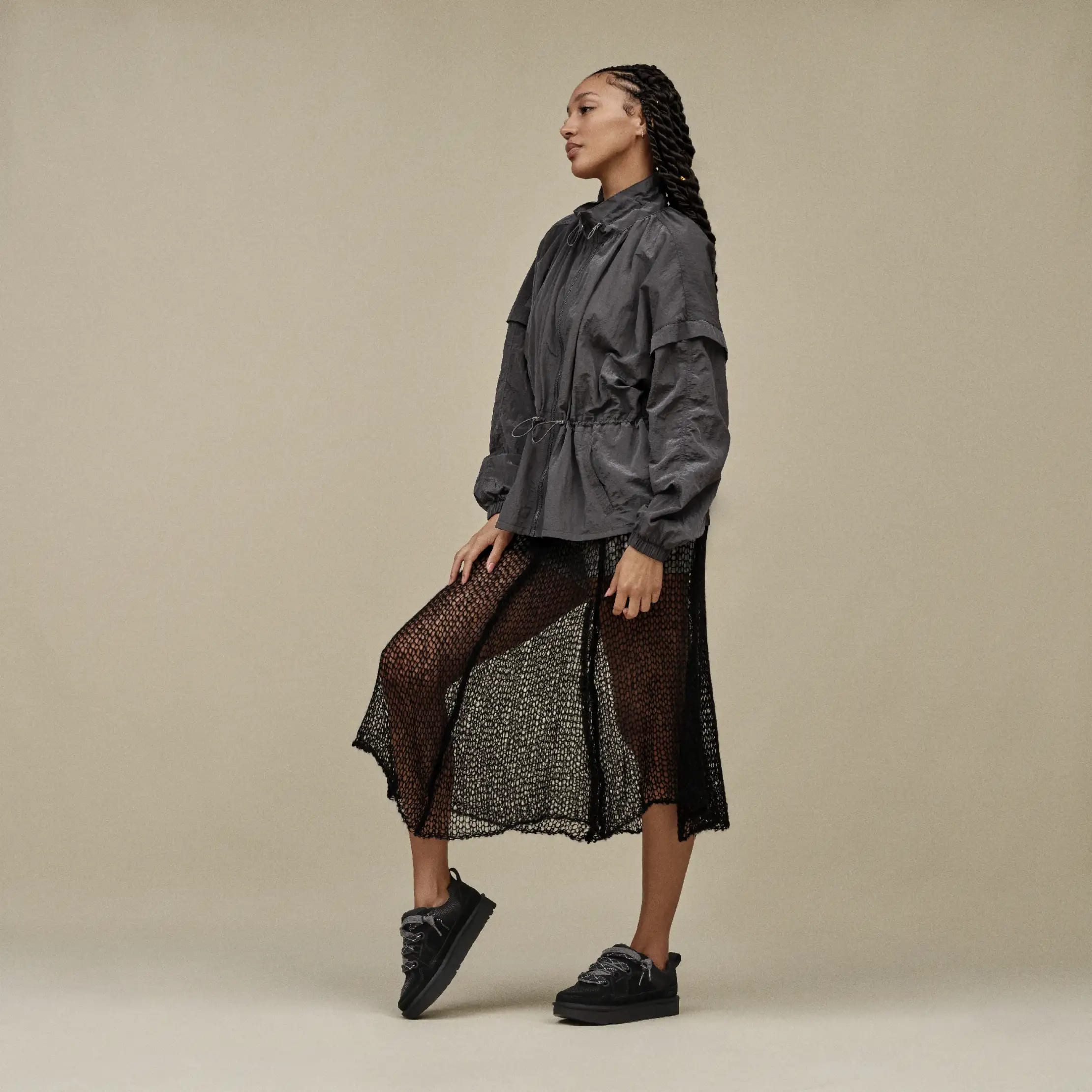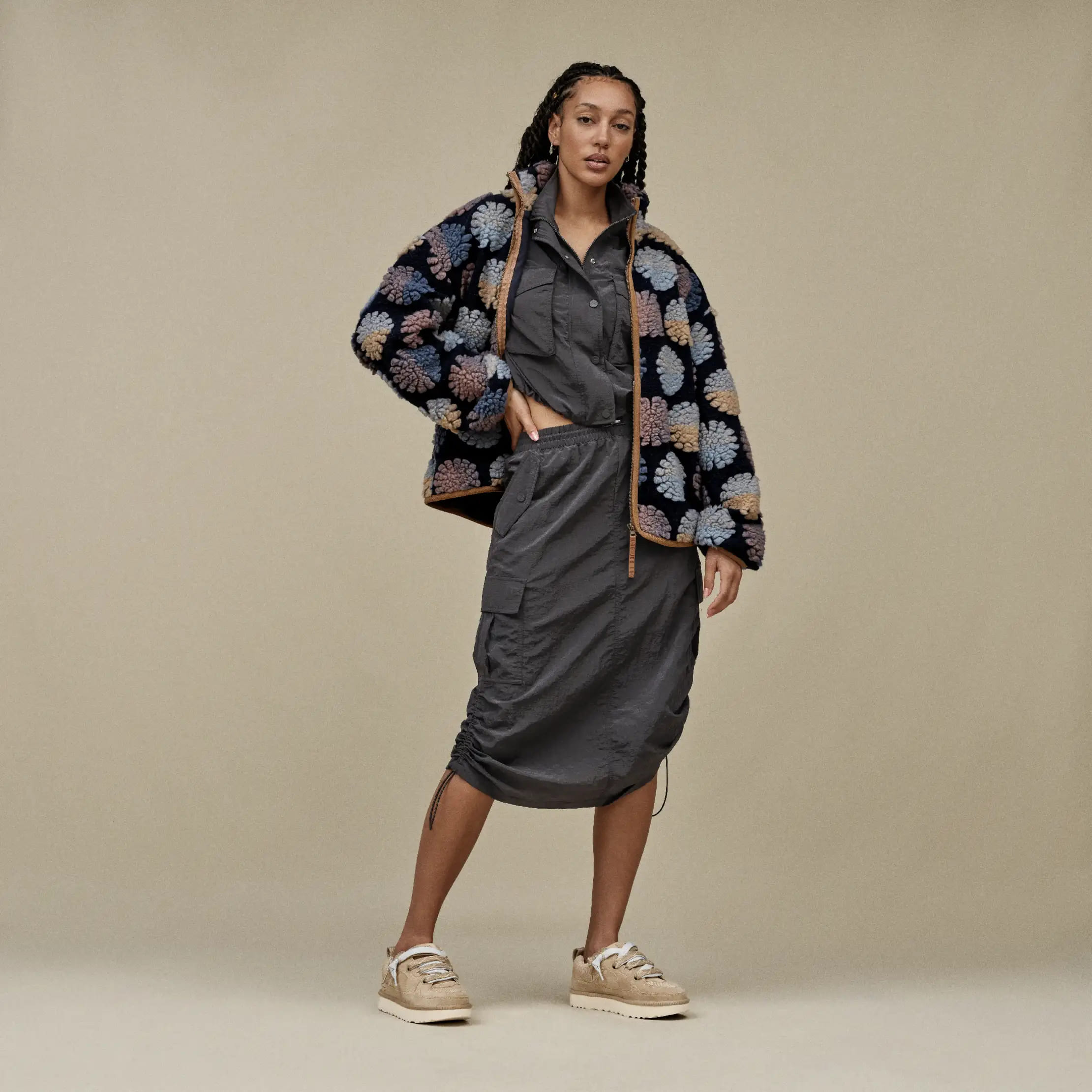 Верх выполнен из текстурированного сочетания натуральной замши и переработанного баллистического текстиля, что придаёт классический кроссовочный вид. Подошва из упругой EVA на основе сахарного тростника обеспечивает фирменный комфорт UGG® и делает обувь особенно лёгкой при ходьбе.