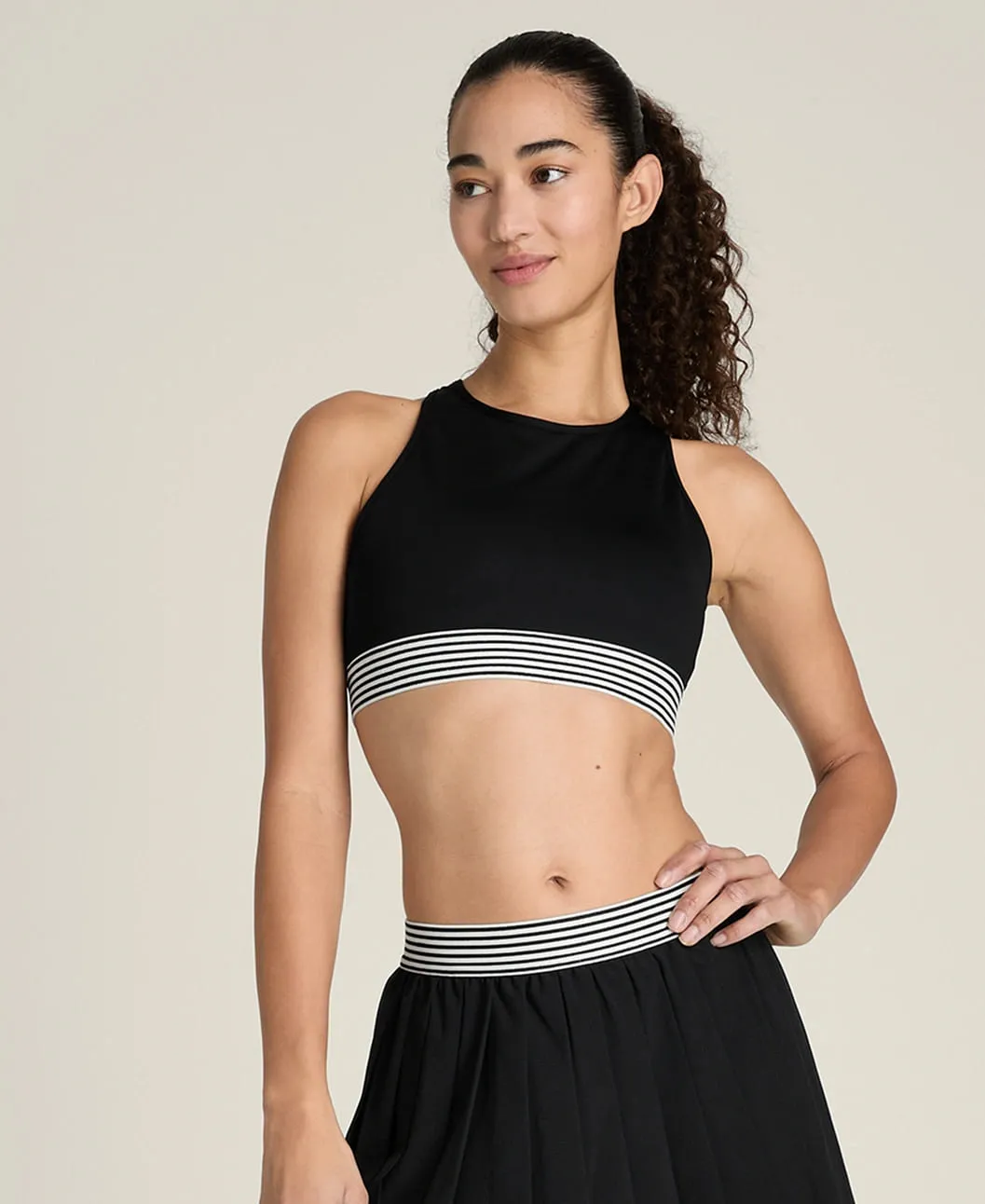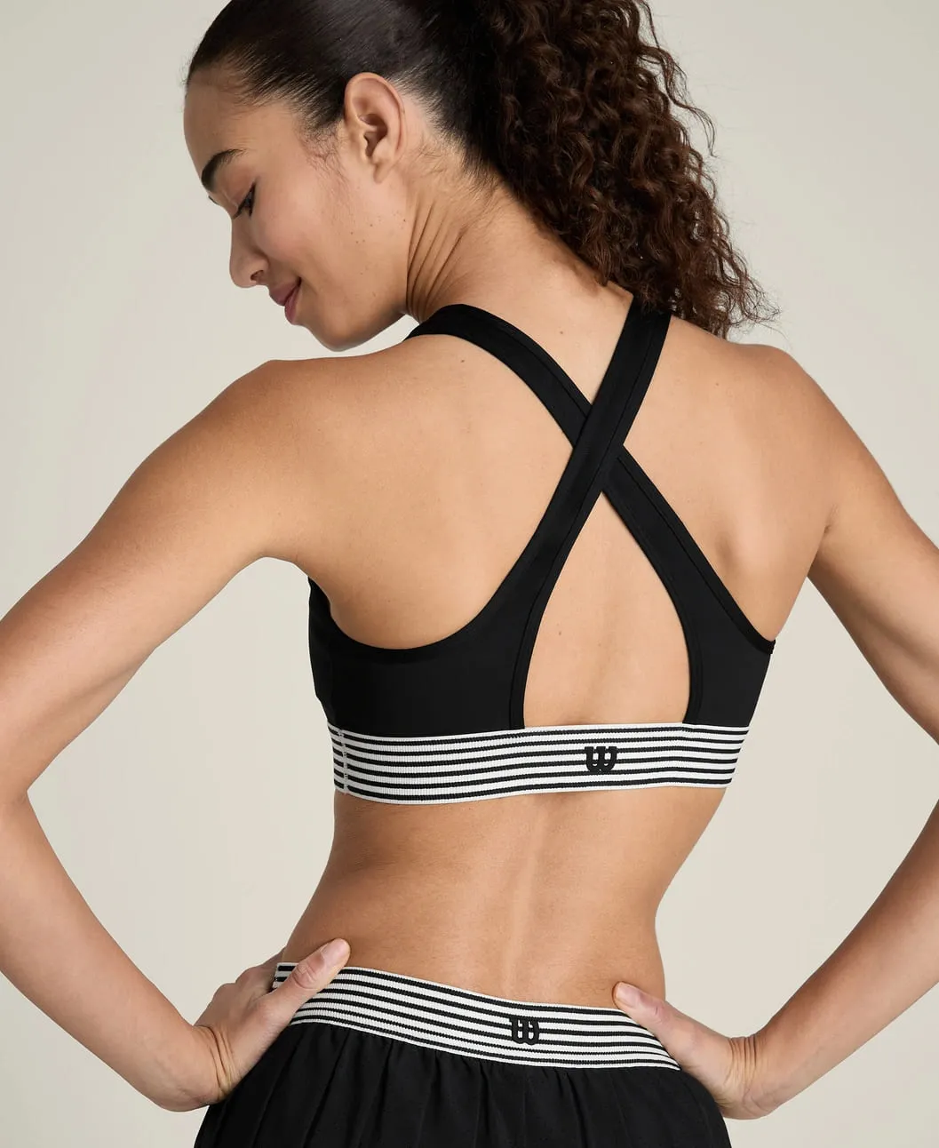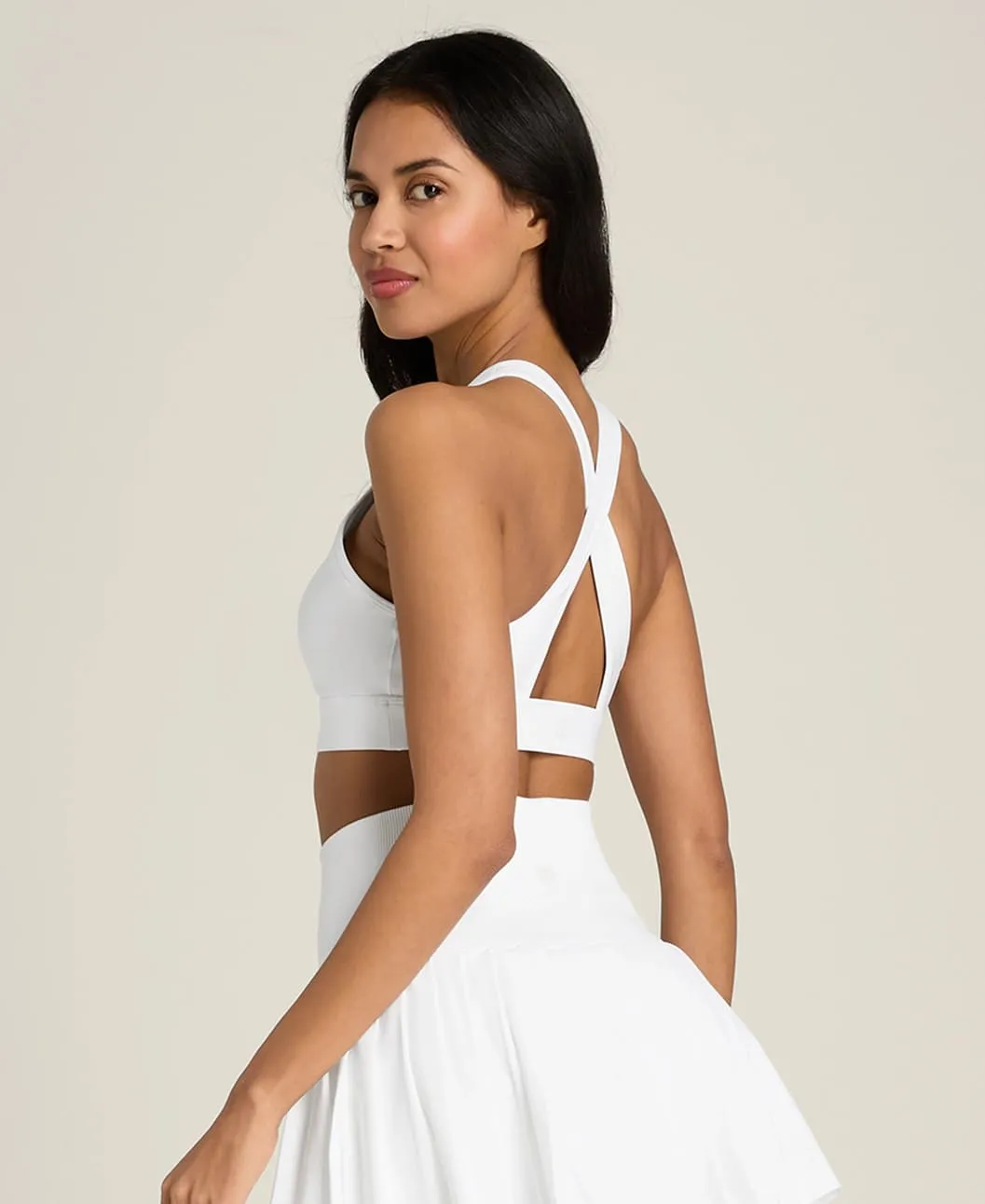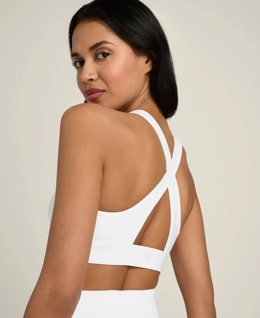 Высокий воротник создаёт чистый, аккуратный силуэт. Крест-накрест расположенные спинные лямки удобно сидят под майками с открытой спиной или рэйсербеком, обеспечивая поддержку и свободу движений.