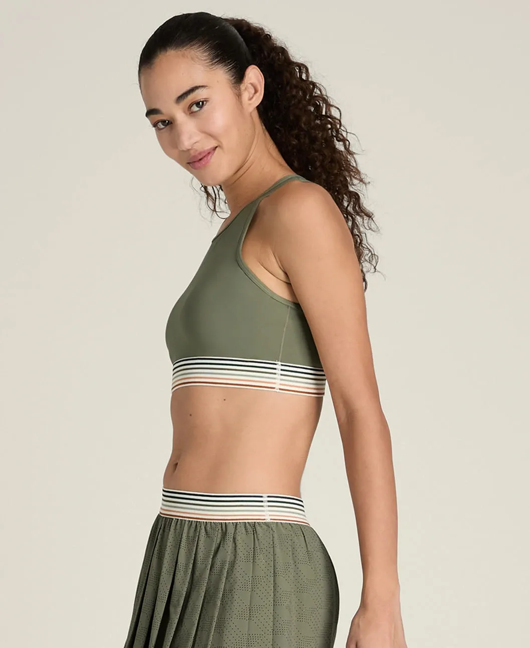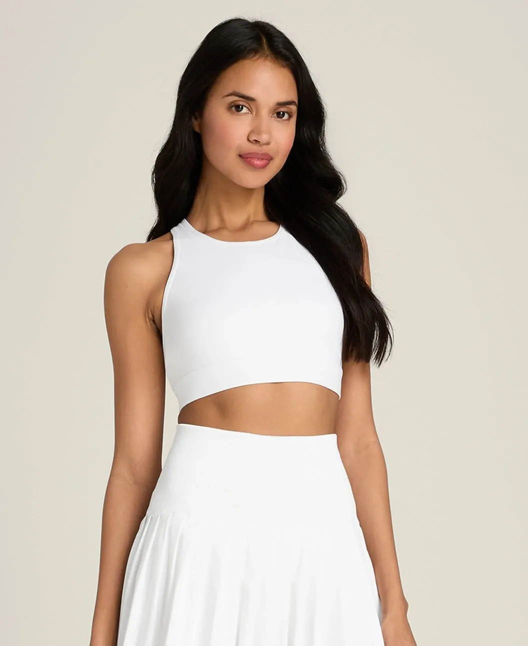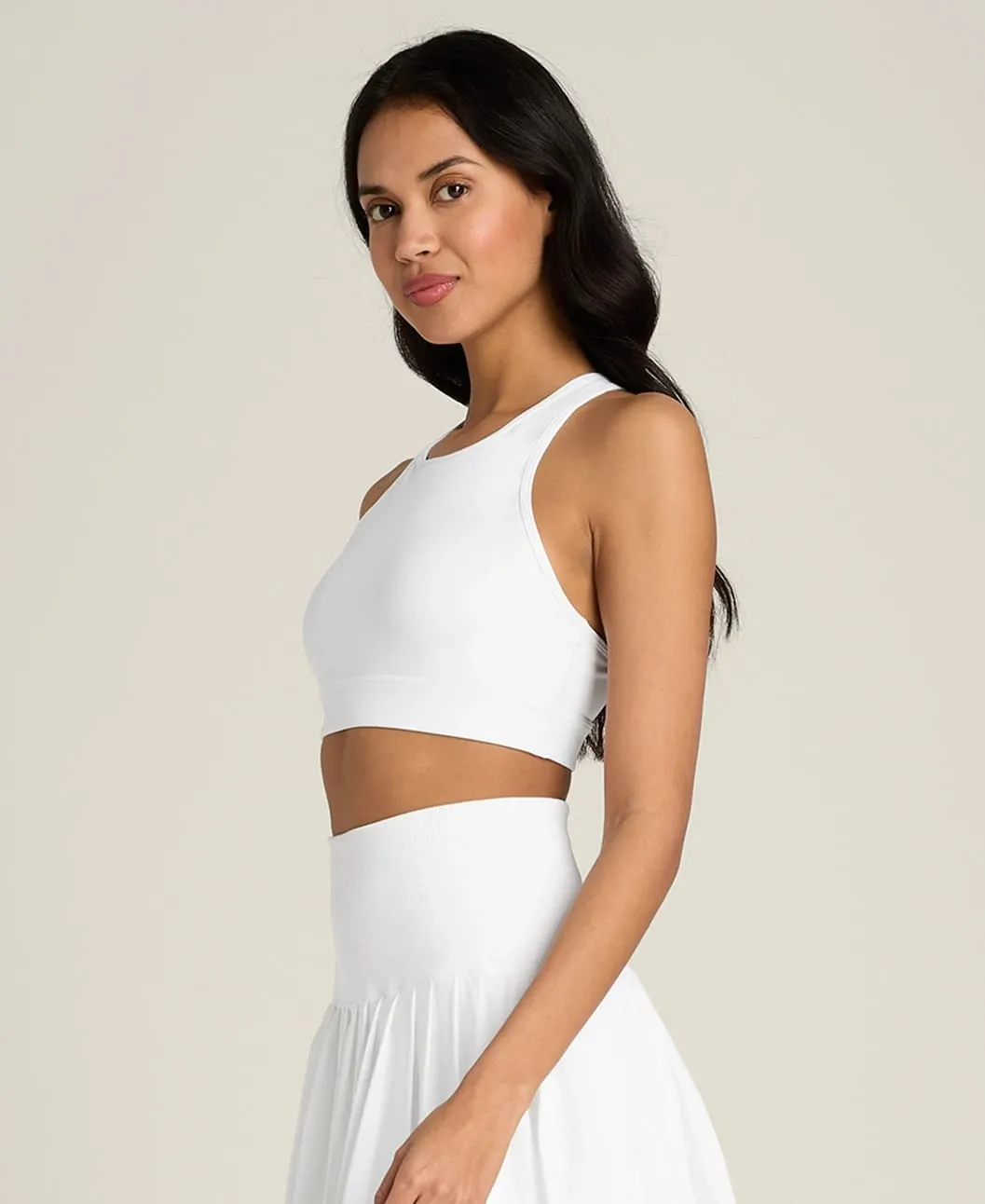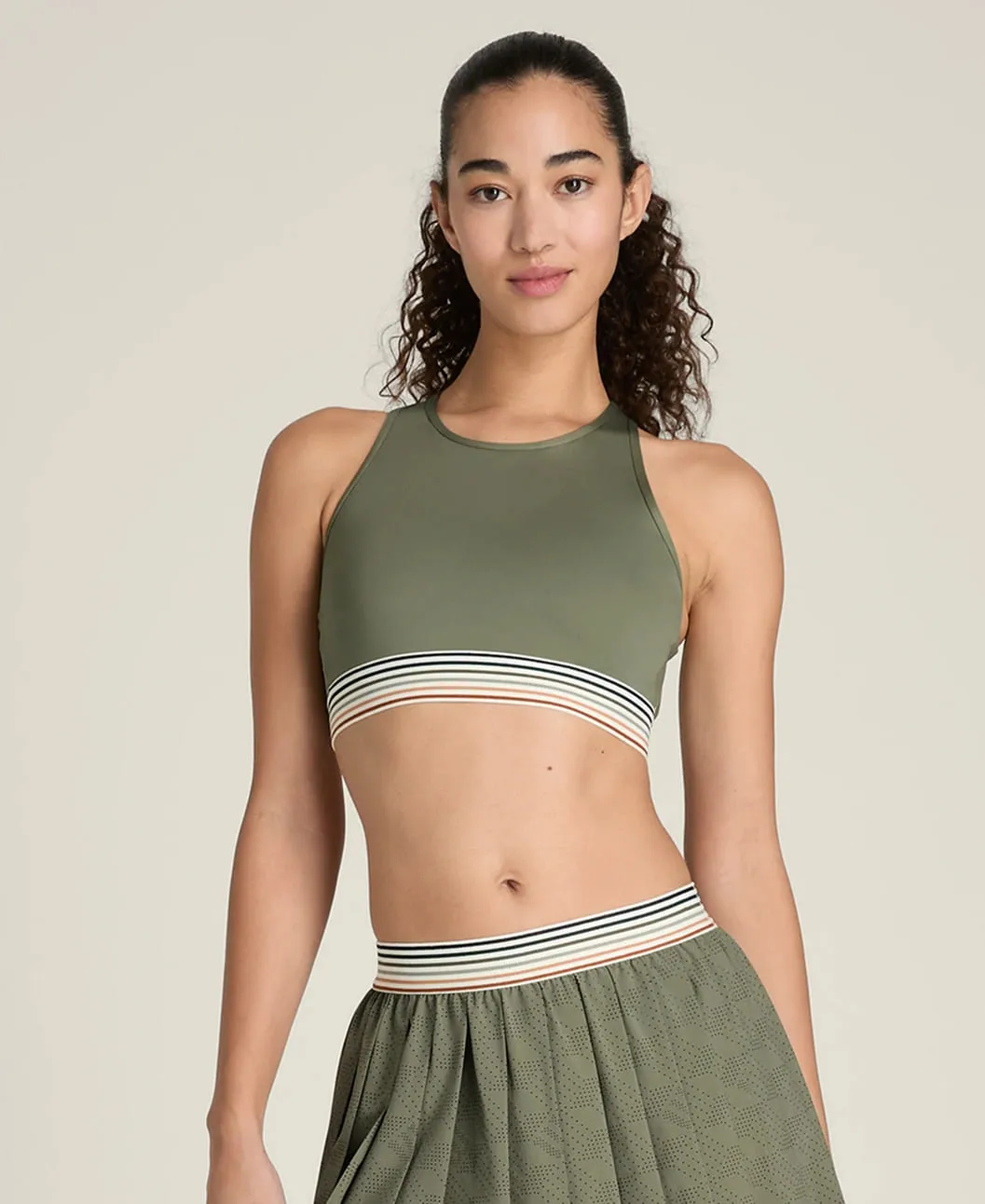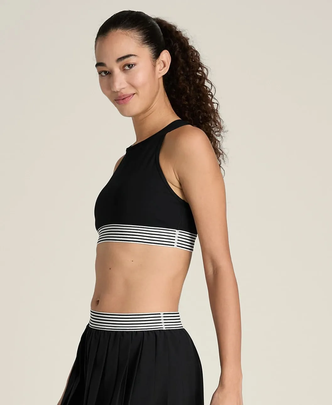 Высокий воротник создаёт чистый, аккуратный силуэт. Крест-накрест расположенные спинные лямки удобно сидят под майками с открытой спиной или рэйсербеком, обеспечивая поддержку и свободу движений.